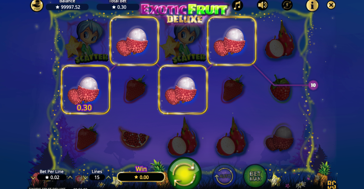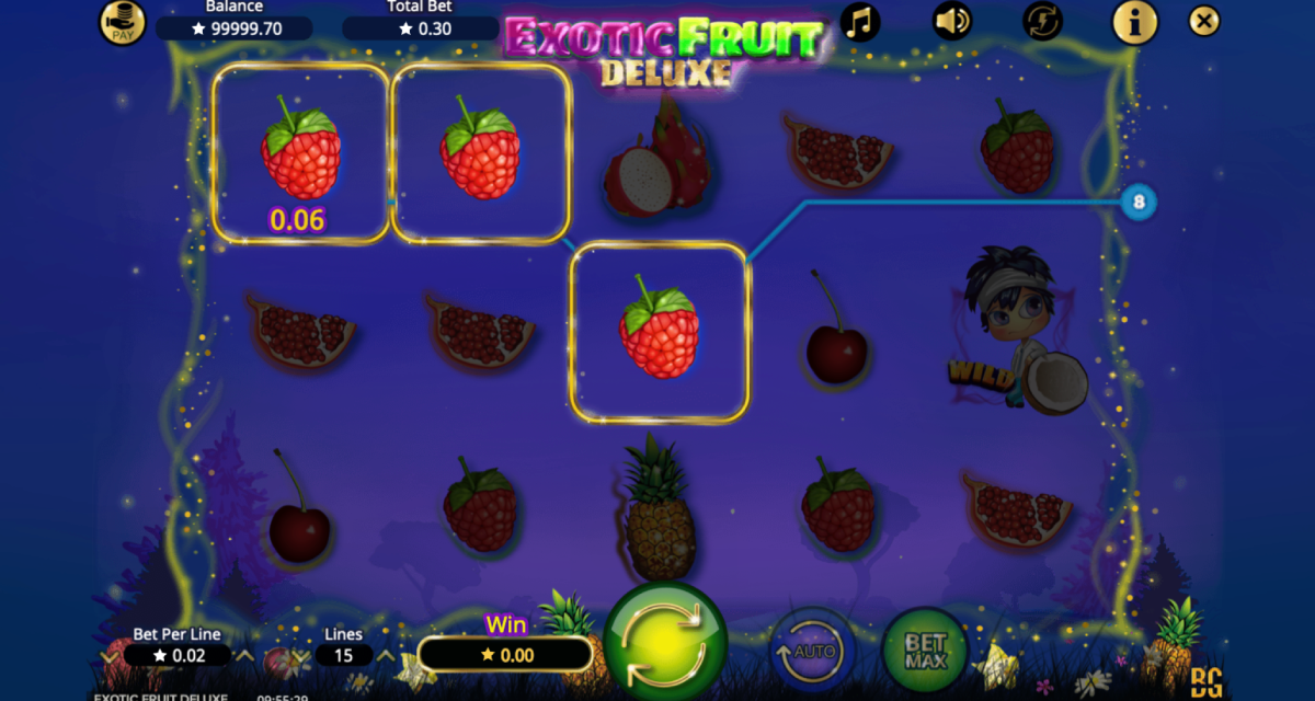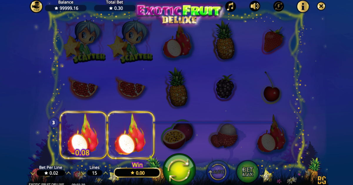 The gameplay of the Exotic Fruit Deluxe slot machine is similar to other Booming Game productions. To begin playing, the player must first choose a coin value between 0.01 and 30. The limit is set that high because each line only allows one coin. The Bet Max option can be used to place the highest bet possible. Players have the option to spin the reels manually or automatically.