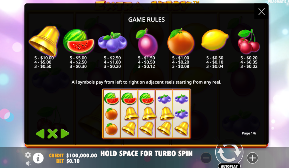 The biggest downsides of Extra Juicy is that there is no progressive jackpot and no bonus game. That said, there are some mouth-watering wins. If you like fruits and bars slot machines with flavorful symbols and extra juicy payouts, this pokie may be a good fit for you! Additionally, Extra Juicy is an all ways pays slot machine. Ultimately, this means the game pays from right to left, and the left to the right. Most of the pokie machines only pay one way. Certainly, this is a good thing!