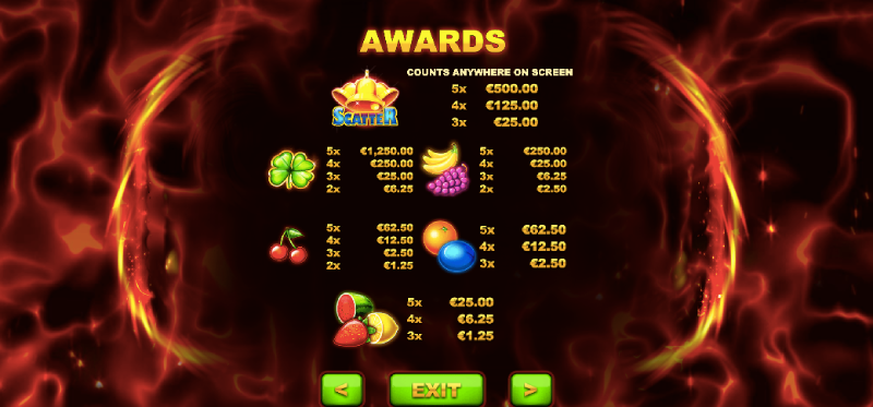 It’s great that this slot game focuses mainly on its gameplay, which is a nice change. The visuals are impressive and the occasional music adds to the thrilling and exciting atmosphere of the slot.The bright and bold colors of the fruit symbols on the screen are very noticeable. The red and black background is especially luxurious.