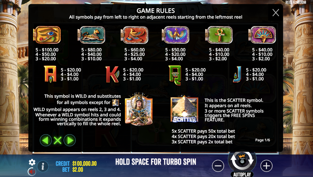 The Pyramid triggers the free spins bonus round, you just need to land three of them somewhere across your reel grid. Interestingly, the free spins round is a multi-level game where you start out at level one and potentially progress up to level six depending on how many wilds you may or may not land during the round. Each new level sees one of your higher-value symbols being boosted to the next level. On level two, for example, fan symbols become ankhs and the payout increases accordingly. It may sound a bit confusing but it’s all fairly simple and straightforward.