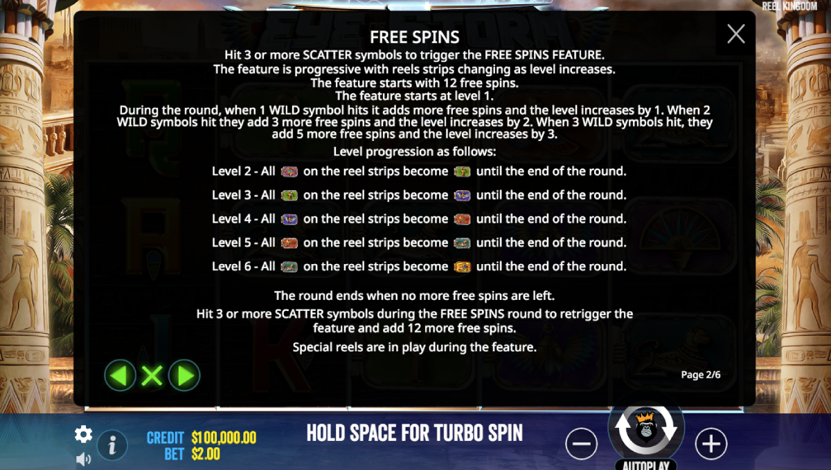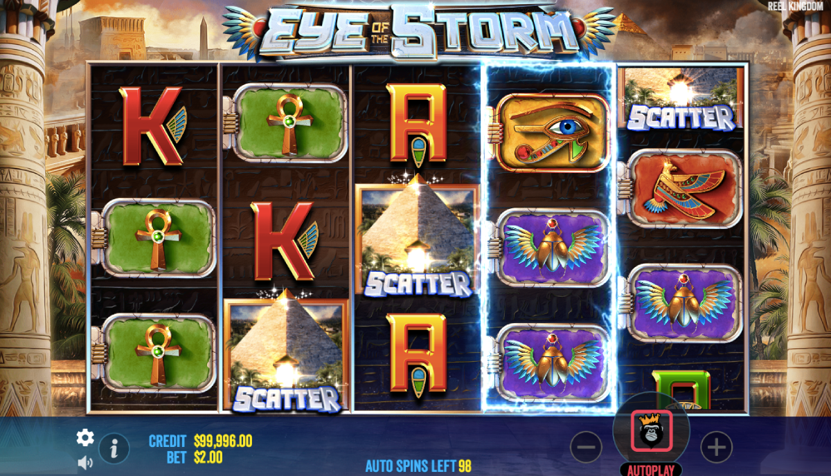 Eye of the Storm is a nice Egyptian-themed slot. The graphics are great and the features are nice and simple to get your head around. Stakes range from 0.10 to 250.00 so should suit recreational players and regulars alike. The Return to Player percentage is also very generous at 96.71% and, though this is considered a high volatility game, you should see you get some nice returns from time to time. If you like simple games with some potentially nice multipliers this is the game for you!
