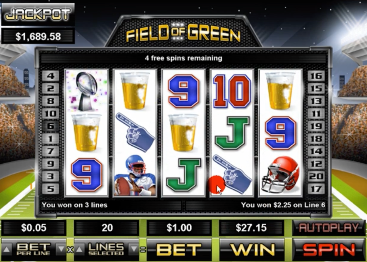 Field of Green is a five reel, twenty pay line slot game with a progressive jackpot. The football/soccer themed game also features scatter wins, a multiplier, free spins, a bonus round and a wild substitute symbol.