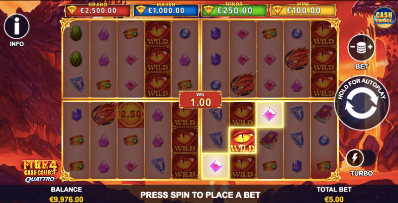 Fire 4: Cash Collect Quattro slot machine by Playtech is a new online slot with a fantasy theme and a distinctive four-reel layout. To create winning combinations, align dragon-themed symbols such as dragons, dragon eggs, and dragon-eye wilds. You can trigger a thrilling free spin feature by landing cash collect and all-collect symbols when you play Fire 4: Cash Collect Quattro on your mobile, tablet, or desktop.