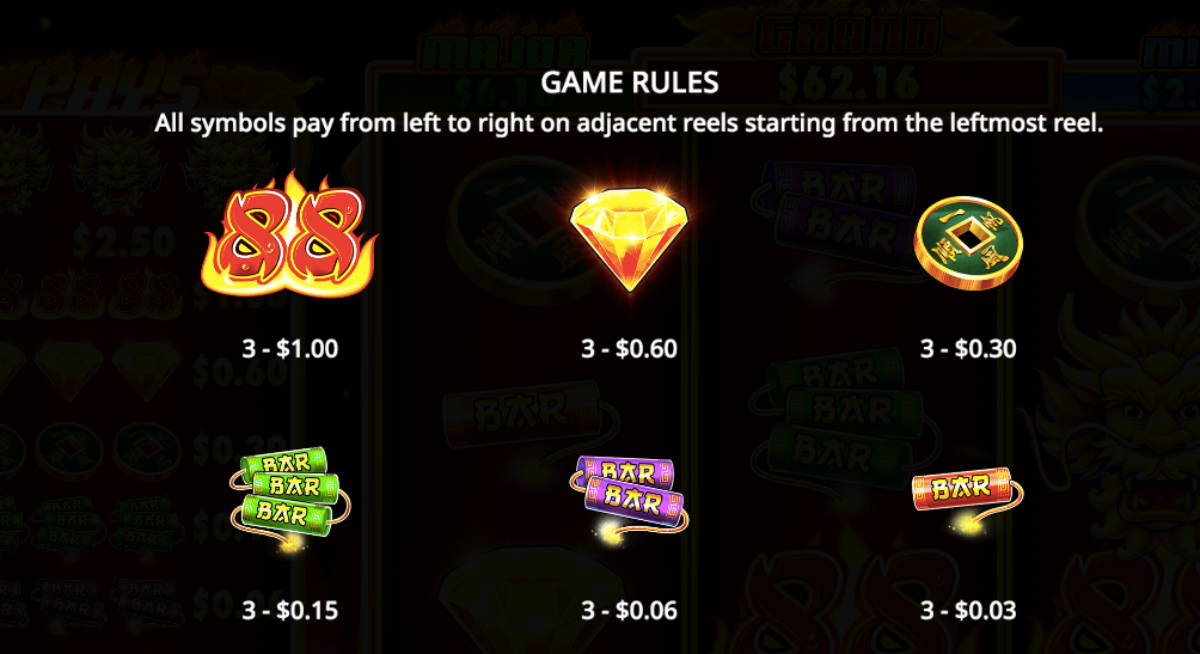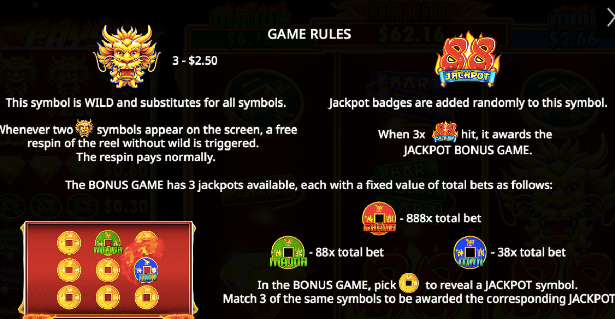 Watch out for the dragon symbol. The wilds of any slot machine are always outstanding. Also, keep your eyes open for the Fire 88 Jackpot symbol. Score three Fire 88 Jackpot icons on the wheels are triggered the Jackpot feature. As a result, you will head to a new screen. After you get to the new screen, you will see nine gold coins. Most importantly, there are the Mini, Minor or Grand icons behind them. Pick the gold coins and score three matching ones. Hence, that is the key to winning the progressive jackpot.