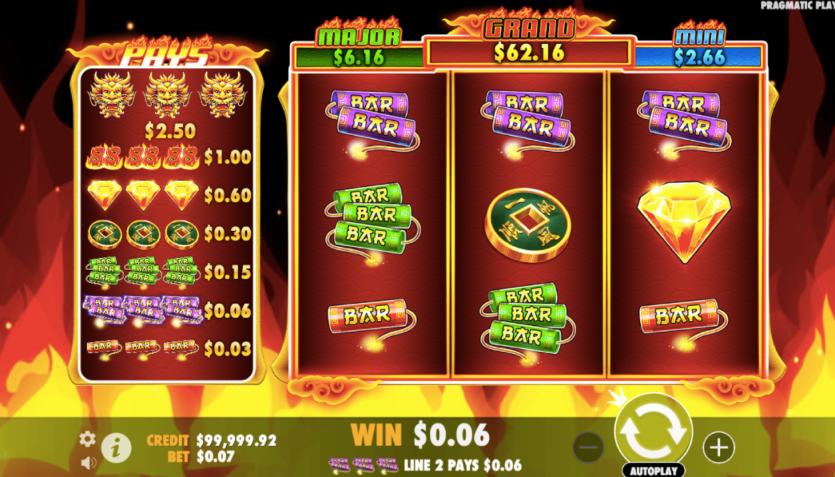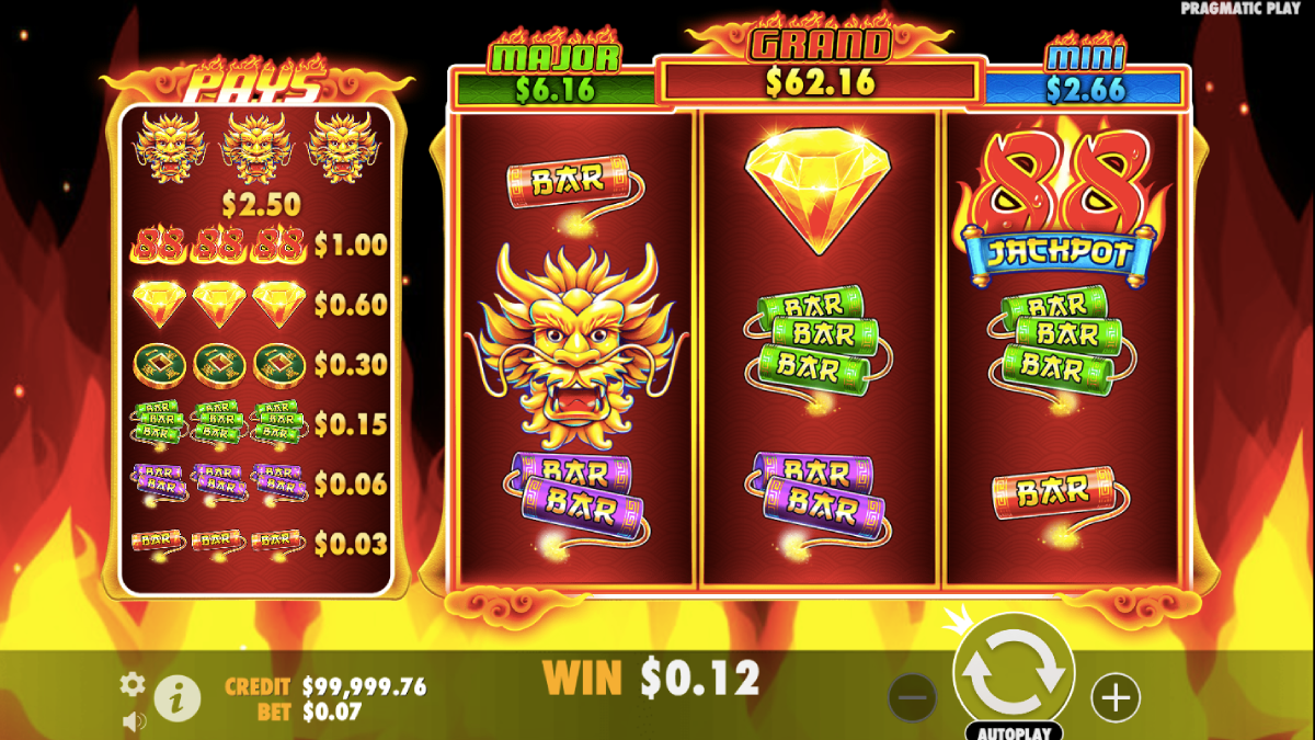The Fire 88 slot machine has three reels with seven pay lines. Pragmatic Play casino software powers this Asian themed online slot machine that has a progressive jackpot. This online slot machine has a 96.45% return to the player according to the official Pragmatic Play site.