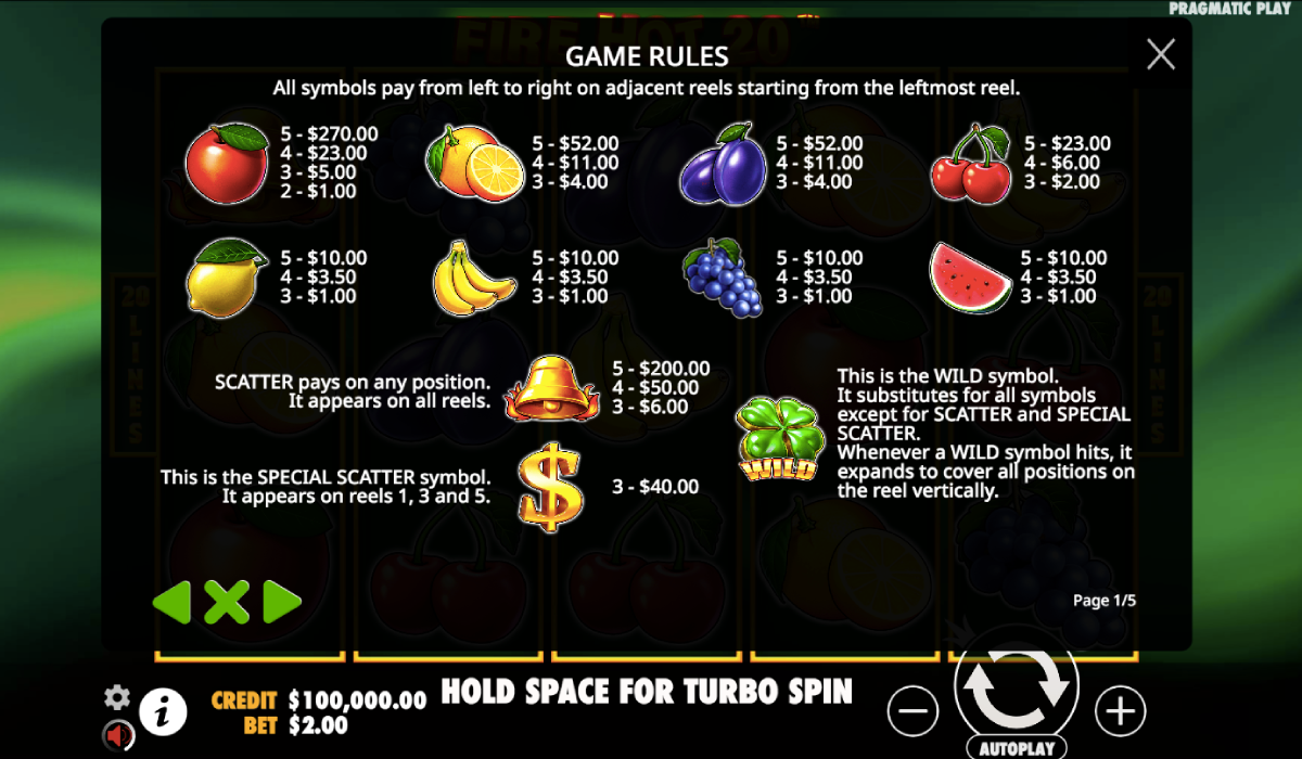 Fire Hot 20 is a game that includes special feature like Wilds, stacked symbols, Scatter Pays, and more. The game also has a bonus where you can get free spins. This is usually the best part because this is often when you can win large sums of money.