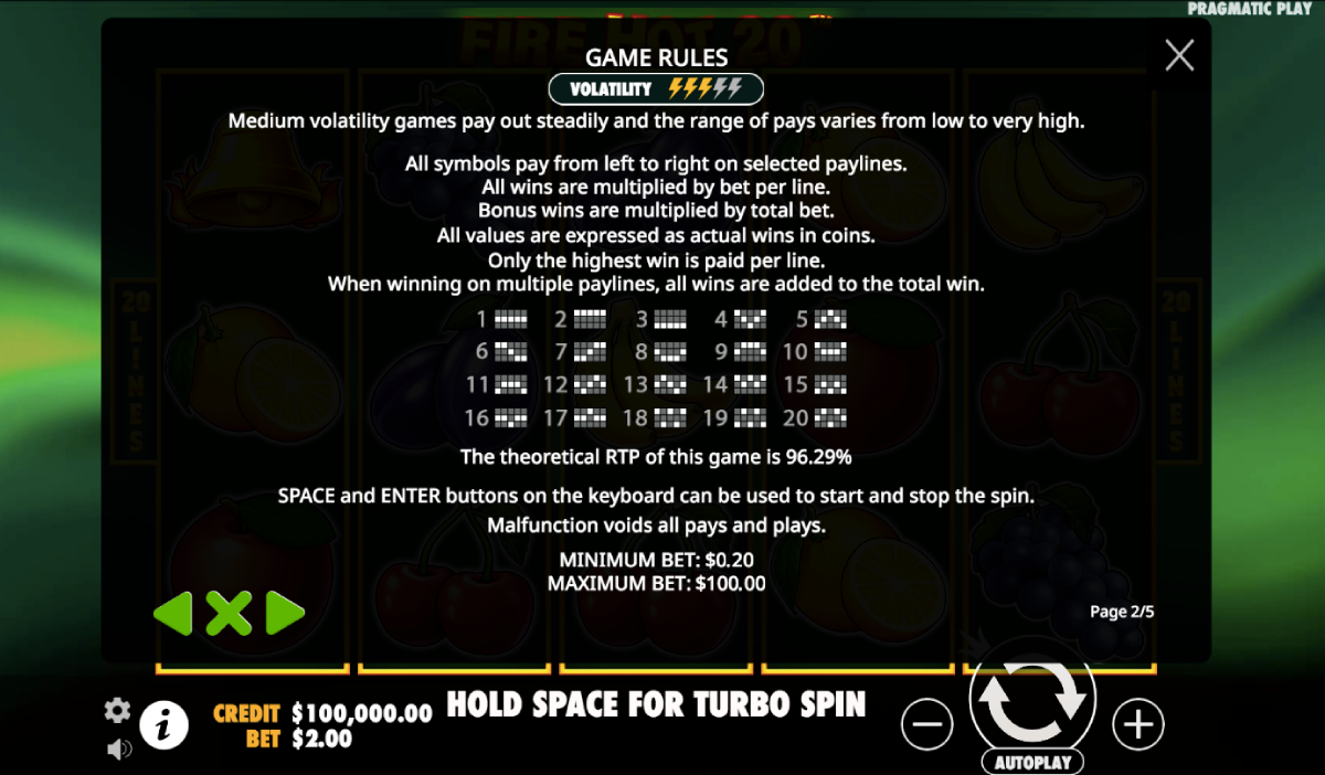 With a payback of 96%, the RTP for Fire Hot 20 slot is considerate and about average in comparison to other online slots.While, in theory, this game should payout €96 for every €100 inputted, the reality is that the Random Number Generator (RTP) creates random output for each spin.