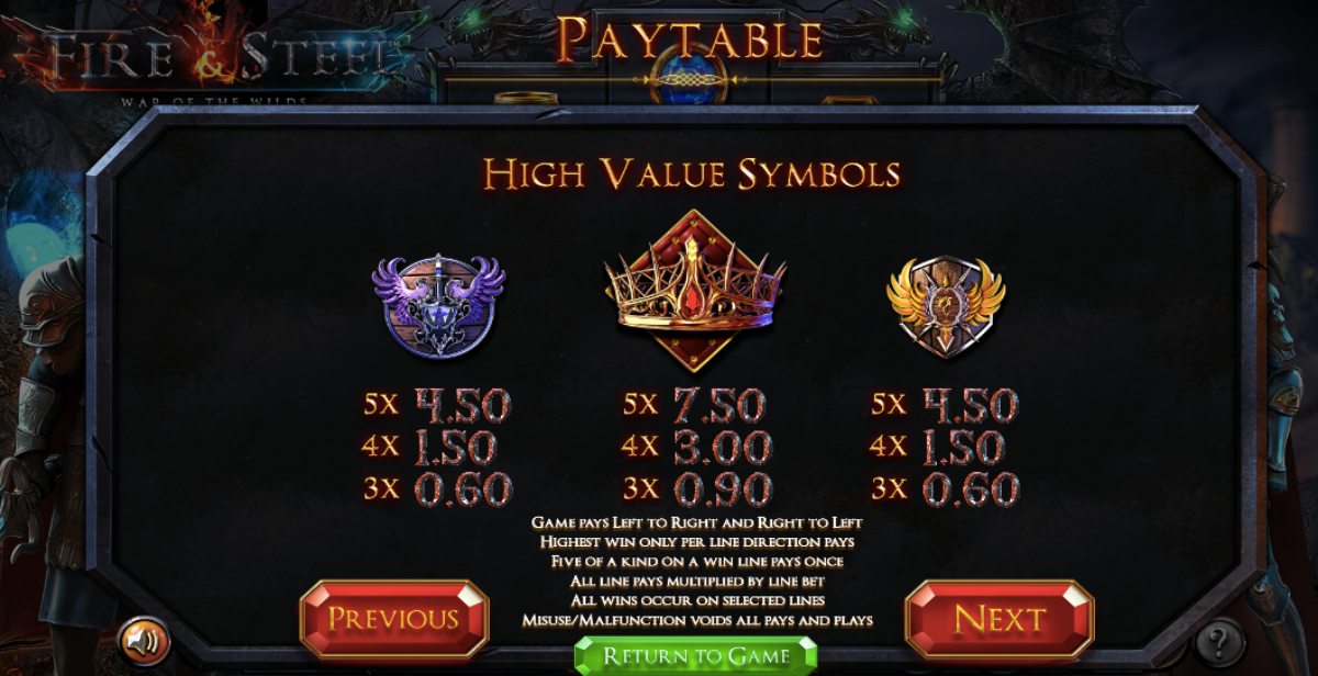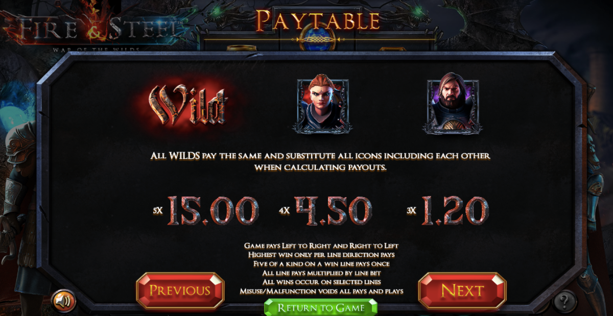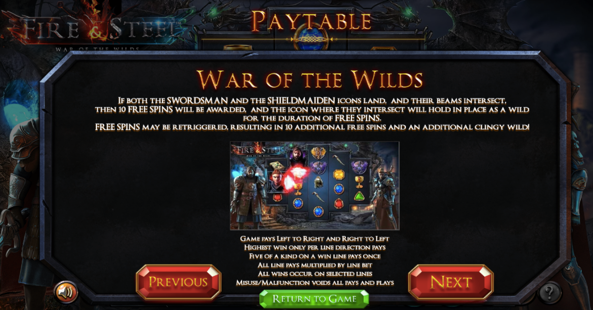 The designer, however, concedes that there will be a few spins that will be considered dry. Although the dry spins might cause a discomfort to the players, they won’t last long. On average, the dry spins, which normally appear when a player is on the main game, do not exceed five. On a glance, Fire and Steel come with an over 95.5 percent (RTP). Besides, the slot has some 2, 500 coins worth of non-progressive jackpot.