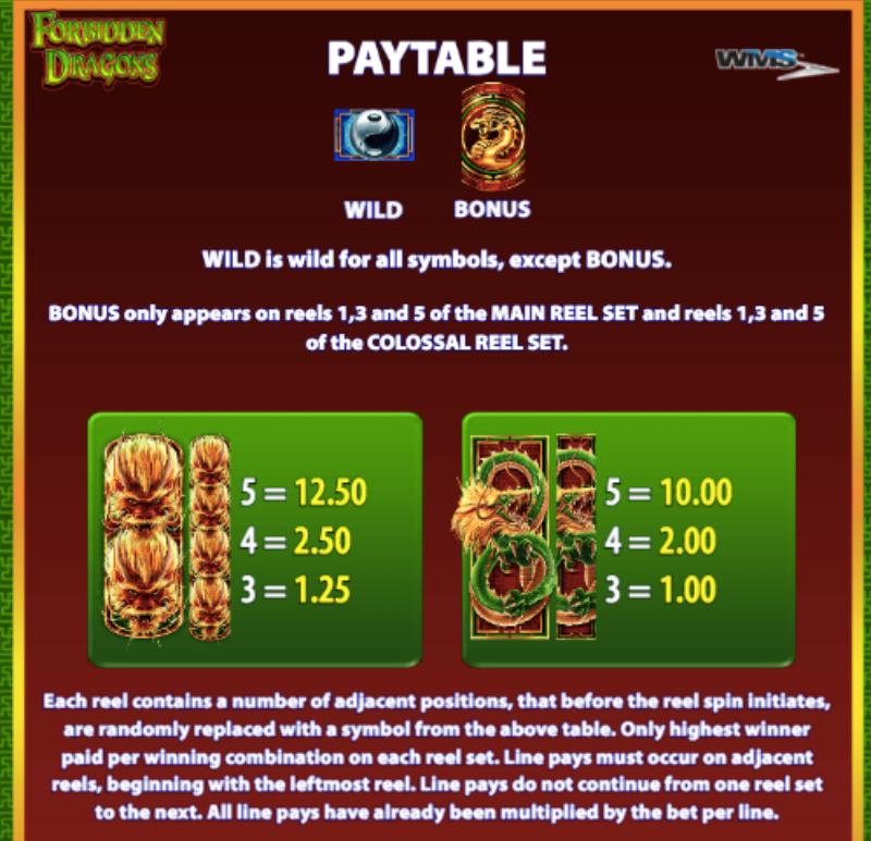 For your information, Forbidden Dragons is a WMS slot game that utilizes the Colossal Reels game engine, which offers the possibility of massive payouts. The slot features a Chinese theme, with well-designed symbols that represent good luck and prosperity, resulting in a visually stunning game.