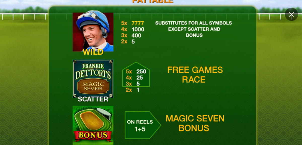 Frank’s Magic Seven is a slot machine game with five reels and 25 paylines. The game features symbols and bonuses inspired by horse racing, along with free spins and a chance to win a jackpot of up to 7,777 times your bet. Your winnings will depend on your betting choices and strategy.