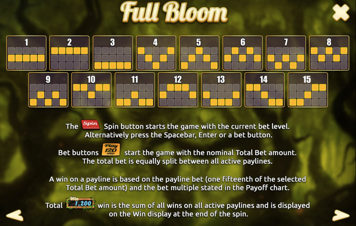 The Full Bloom progressive slot has five reels with 15 pay lines. Slotland software powers this brand new electronic gambling machine with a progressive jackpot. Enjoy this game on the Internet in your web browser with no download instantly or using any mobile device.