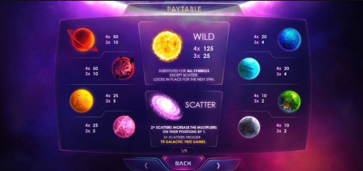 Galactic Streak by Playtech is a space-themed slot game with 4 reels and 20 paylines that provides opportunities to win large rewards. The game incorporates a wild symbol that stays in place for the next spin and offers win multipliers that progressively increase up to 10x with each win, thanks to its win both ways technology. Besides, players get a chance for respins after each win.In the Galactic Free Games feature, you will receive 10 free spins. During these spins, any win multipliers up to 10x will be frozen and can only get bigger.