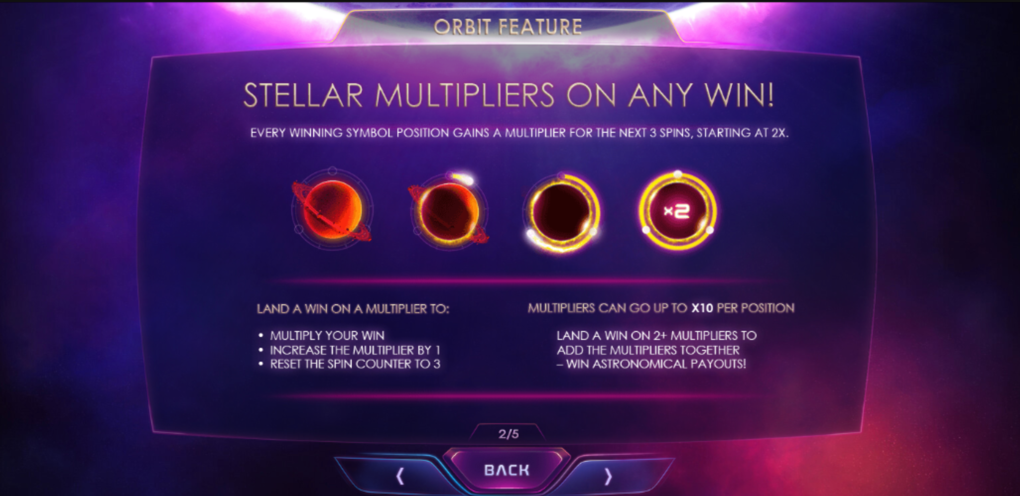 If you manage to get a third scatter, the win multipliers will be applied to the free spins and remain unchanged throughout the feature. The Orbit feature still works during free spins and the multipliers can only go up, so you might end up with a 10x win multiplier on every reel position.