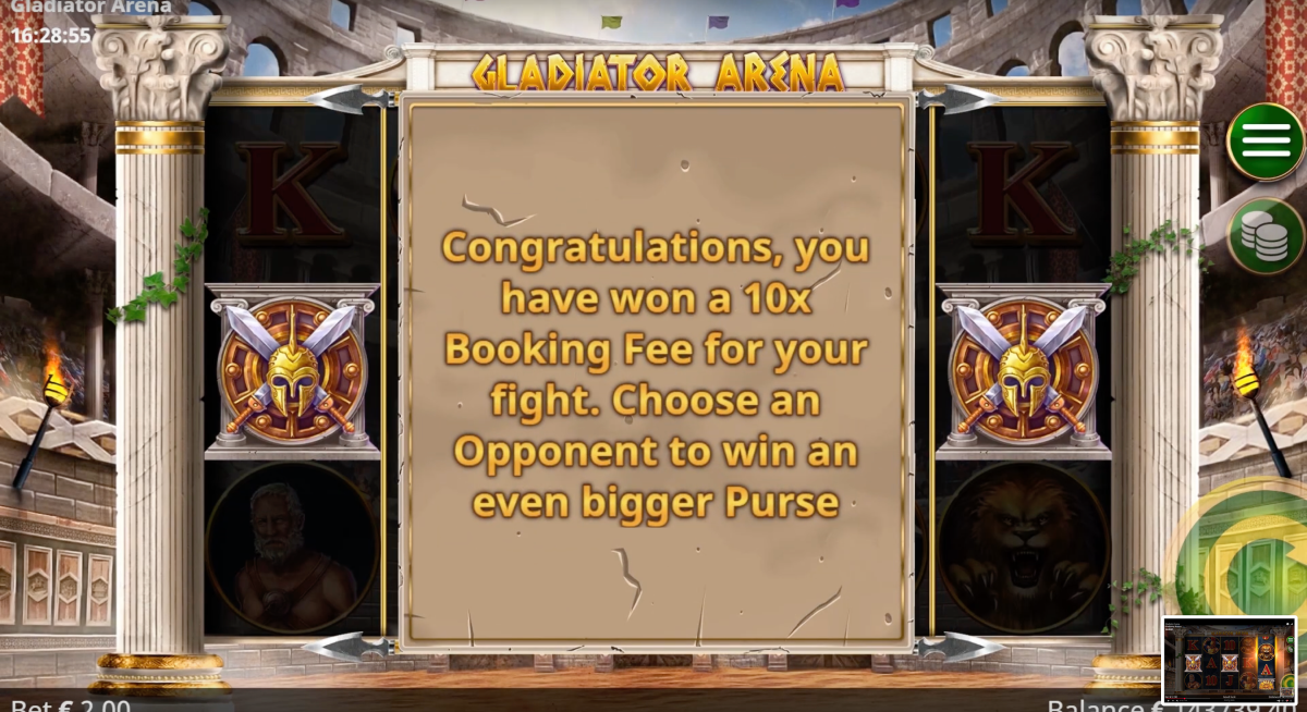 To activate the Pick An Opponent feature, you must have 3 bonus symbols on the screen. Once activated, you must select an opponent before the fight begins. The Lion is the most challenging opponent, followed by the Legionnaire with a trident. On the other hand, the easiest opponent is the Peasant who transformed into a gladiator.