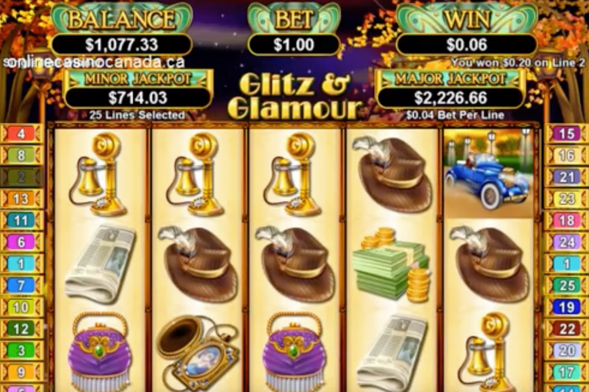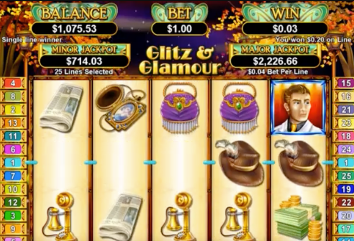 Glitz and Glamour is a five reel, 25 pay line slot game that powers Realtime Gaming (RTG) software. Glitz And Glamour is a decent game to play. The game has nice wins, and they come frequently. The graphics are terrible as this game is from over a decade ago. Therefore, I have played the new Realtime Gaming slot machines. As a result, I like the newer games. The Glitz And Glamour multi-pay line machine feature a 1920βs Hollywood theme with a maximum jackpot win of 12,000 coins; free spins scatter wins, bonus games, and wild substitute symbols.