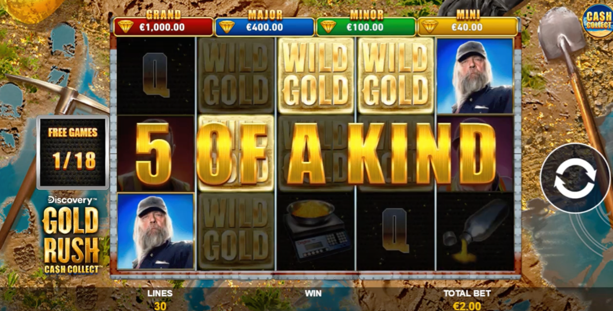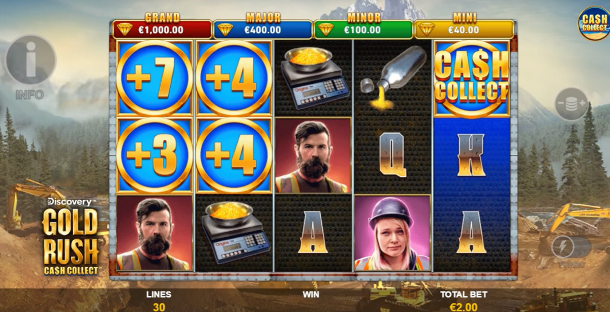 The online video slot called Gold Rush Cash Collect has a 5×3 grid and 30 lines. It has special features such as Cash Collect symbols, Wild symbols, the Nudge Feature, Free Games, the Pay Dirt Feature, and the Cash Collect Prizes.
