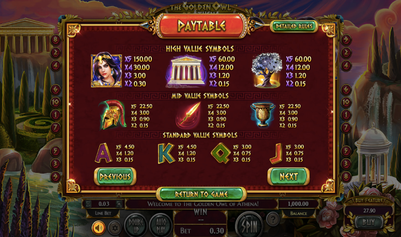 Experience exciting features like scatter symbols, free spins, and numerous wilds while playing Golden Owl of Athena. You also have the chance to double your wins through the gamble game feature. Furthermore, the highlights Athena as one of the most valuable symbols, making it an incredible game to play. Don’t miss out on spinning these stunning reels.