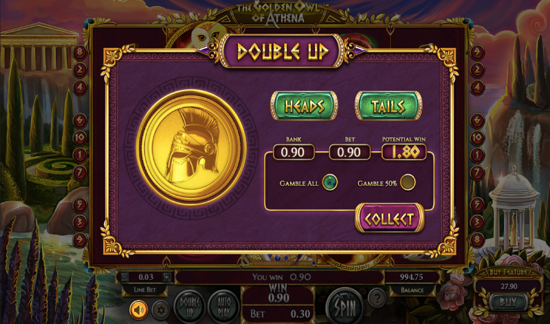 To win in The Golden Owl of Athena, all you need to do is get three or more symbols that match on the game payline. The highest prize available is 500 times your stake, and it comes from the Athena symbol. Athena and the high/mid value slots pay out prizes for two-of-a-kind winning combinations, increasing the game’s volatility. If you win, you can choose to gamble your winnings by betting half or all of it and flipping a coin to double up.