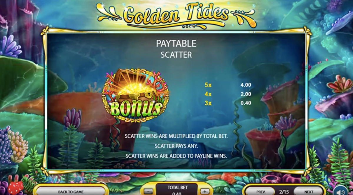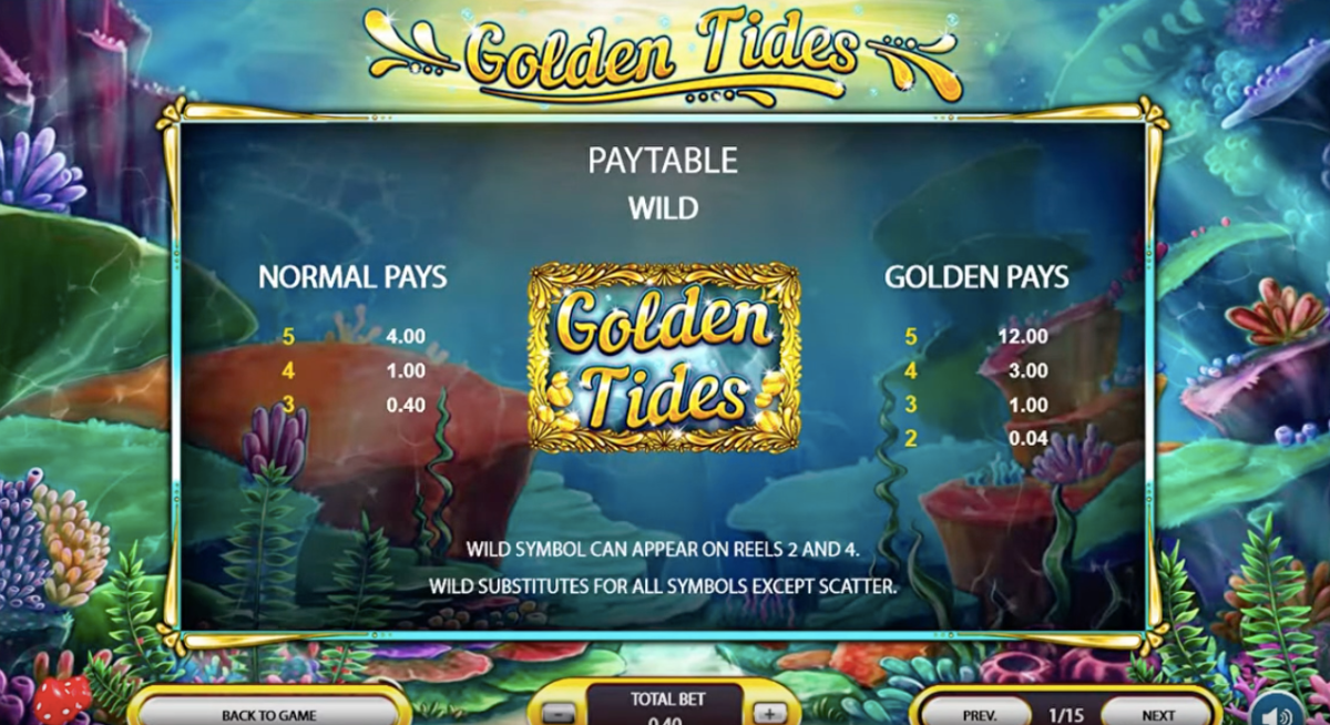 Golden Tides has simple rules that make it easier for gamers to play the online slots. The 2019 release of Golden Tides features five reels, four rows, and 40 paylines. The game is played from left to right, starting from the leftmost reel.