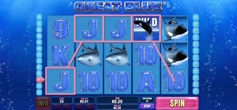 Great Blue has an Auto Play function that you can use to avoid constantly pressing the Spin button. You can find the Auto Start button on the left of your console, and the number of repeat spins is displayed in a window above it. You can adjust the number of spins using the + and – buttons.To use automatic spins, choose a number of spins and click the Auto Start button. The reels will spin and any winning lines will be highlighted as it progresses.