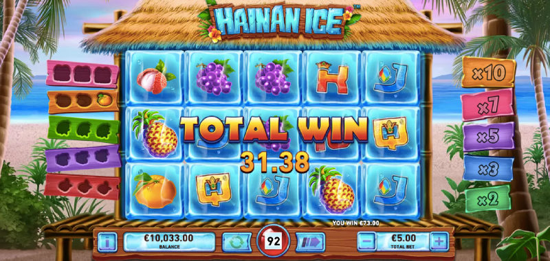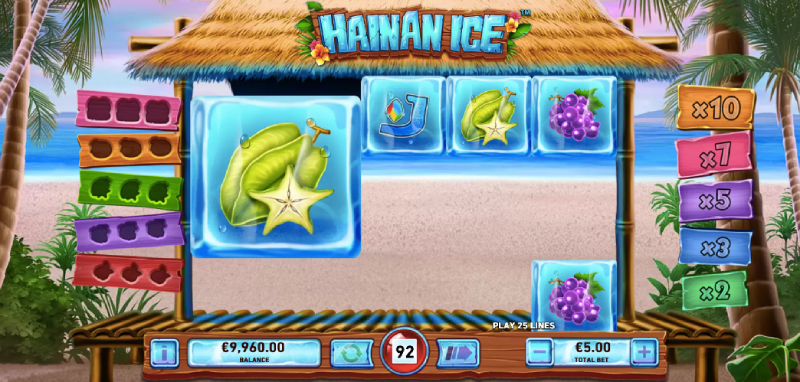 Hainan Ice is set on a tropical island with a lovely beach and palm trees in the background. The reels are placed inside a tiki-style hut and the symbols are encased in ice cubes. The game features low-value symbols such as A, K, Q, J, and 10 in royals. You’ll also find higher value symbols like lychees, grapes, starfruit, oranges, and pineapples. If you get three, four or five of the pineapples in a combination, you’ll win 1, 2, or 8 times your stake.