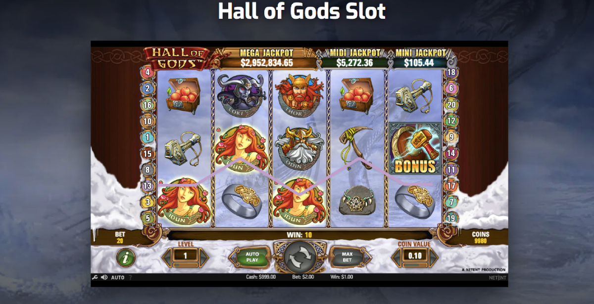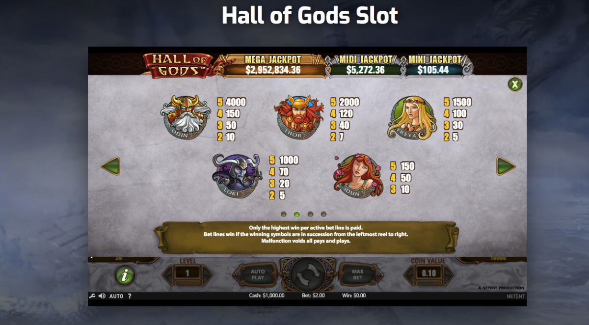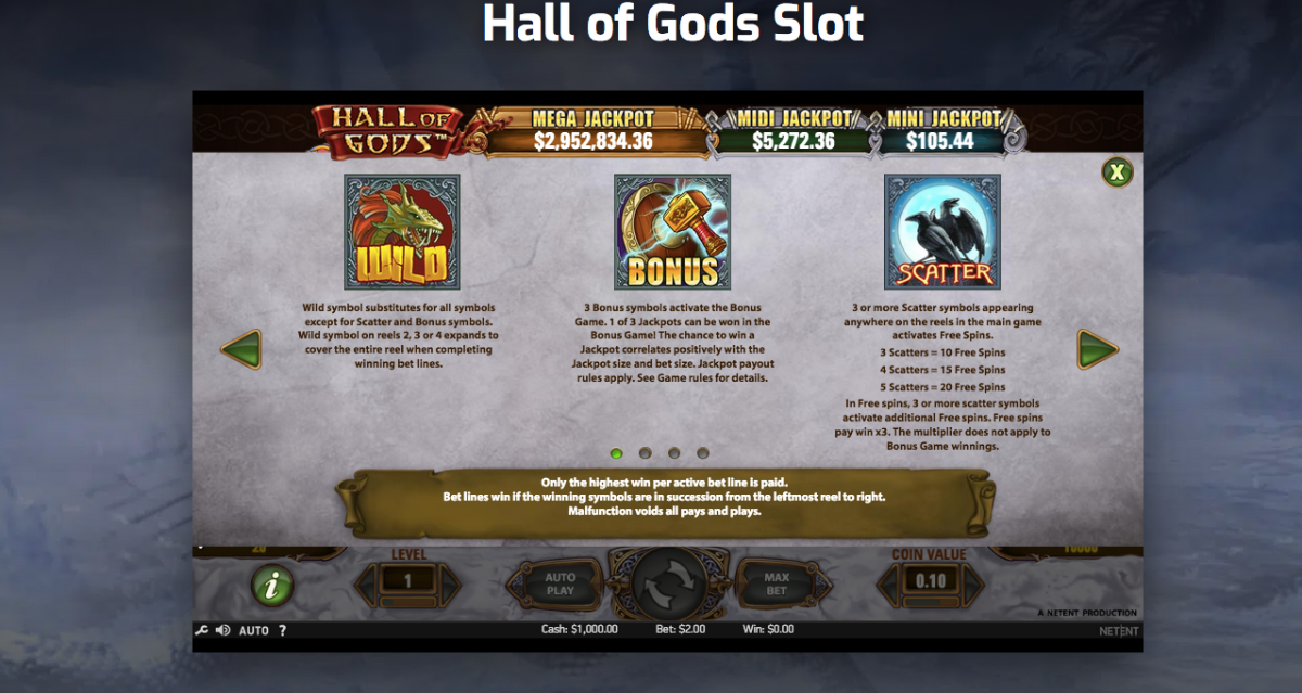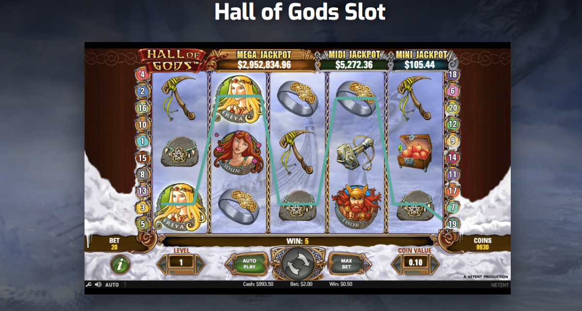 Welcome to the Hall of Gods slots reviews. In this review, we will cover how to play this game, the RTP% (return to player percentage) as well as how to trigger the bonus games. Net Entertainment powers this five-reel, twenty payline video slot. As you explore the world of mythology, you can hop on Viking ships to score huge wins. This game has a Viking theme that is also based on mythology and fantasy.