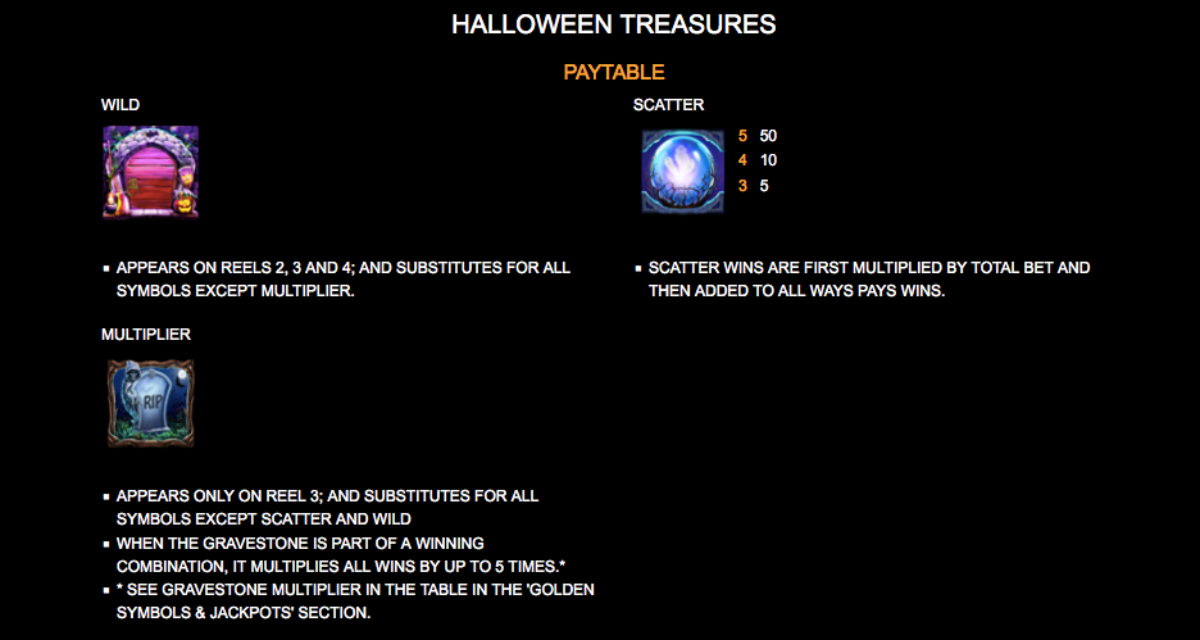 Indeed, the Halloween Treasures slot machine comes with a Haunted House and a Graveyard Stone that are wild. If you land either of them (or both!), they will substitute themselves to form winning combinations. Keep in mind that if you land the Gravestone Wild on the center reel, you will trigger a 5X multiplier!