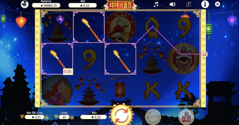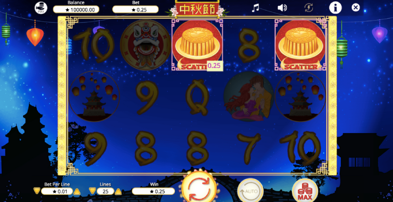 The “Wild” symbol behaves like any other Wild symbol in the game by substituting for regular symbols to form winning combinations. The Scatter symbol, represented by a golden mooncake, is the second unique symbol and can award up to 1,000 times the bet line if 5 of them land.