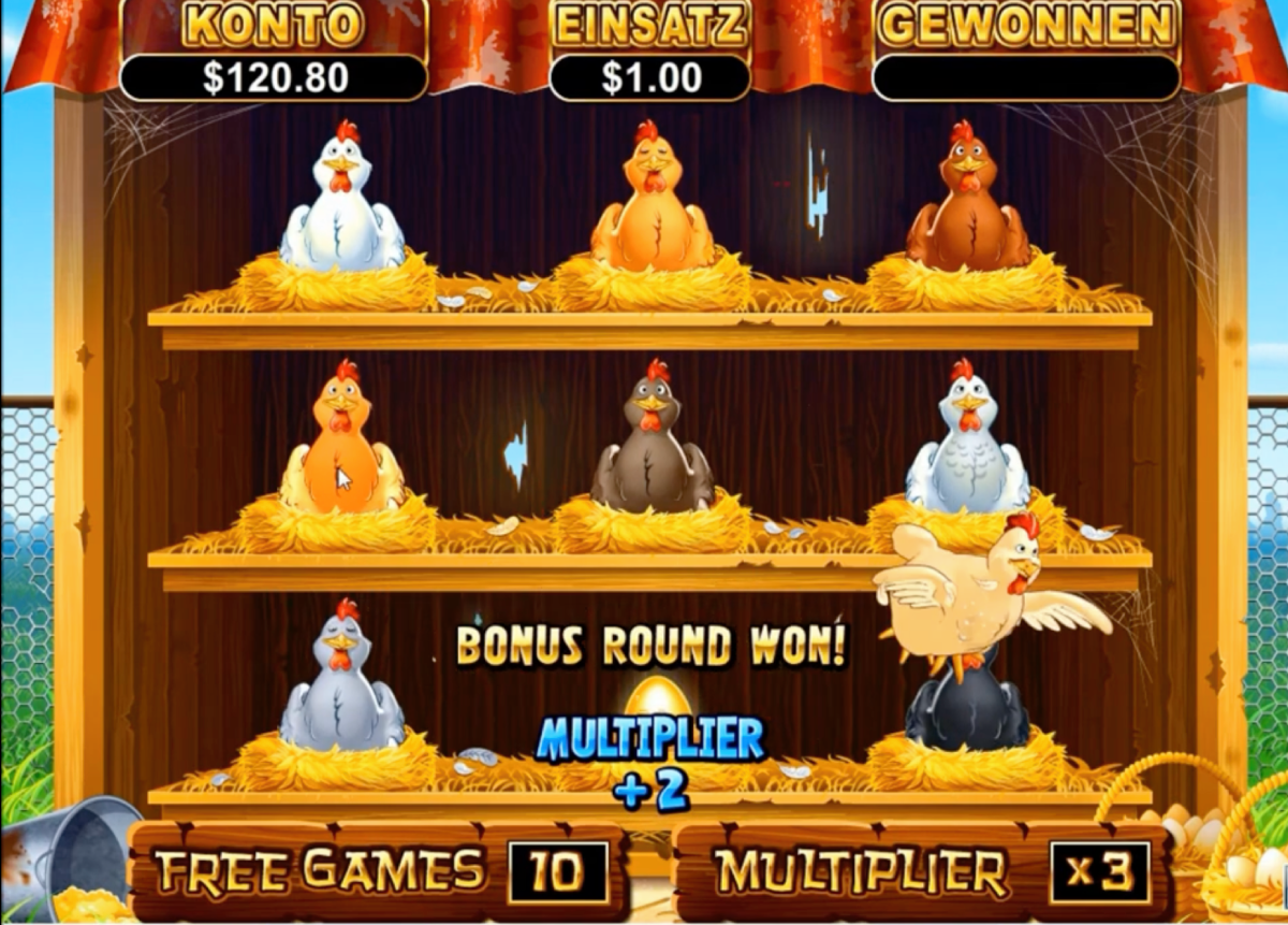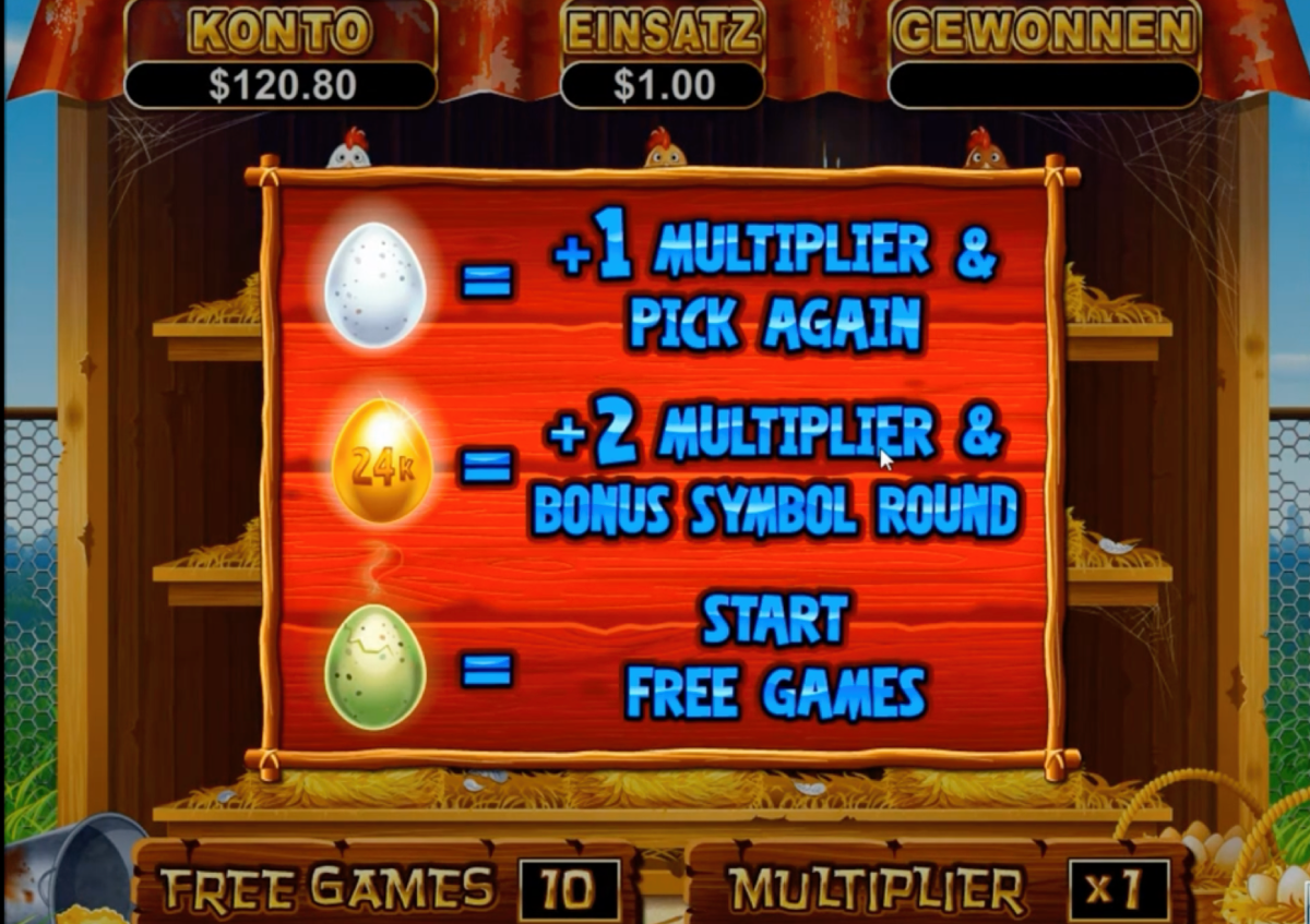 To enter the game, players need to achieve three eggs in a row on the main game. In the mini-game, players will need to choose a hen, and they will reveal the eggs. If the player wants a chicken, which has a rotten egg, it finishes the feature, and the free spins begin.