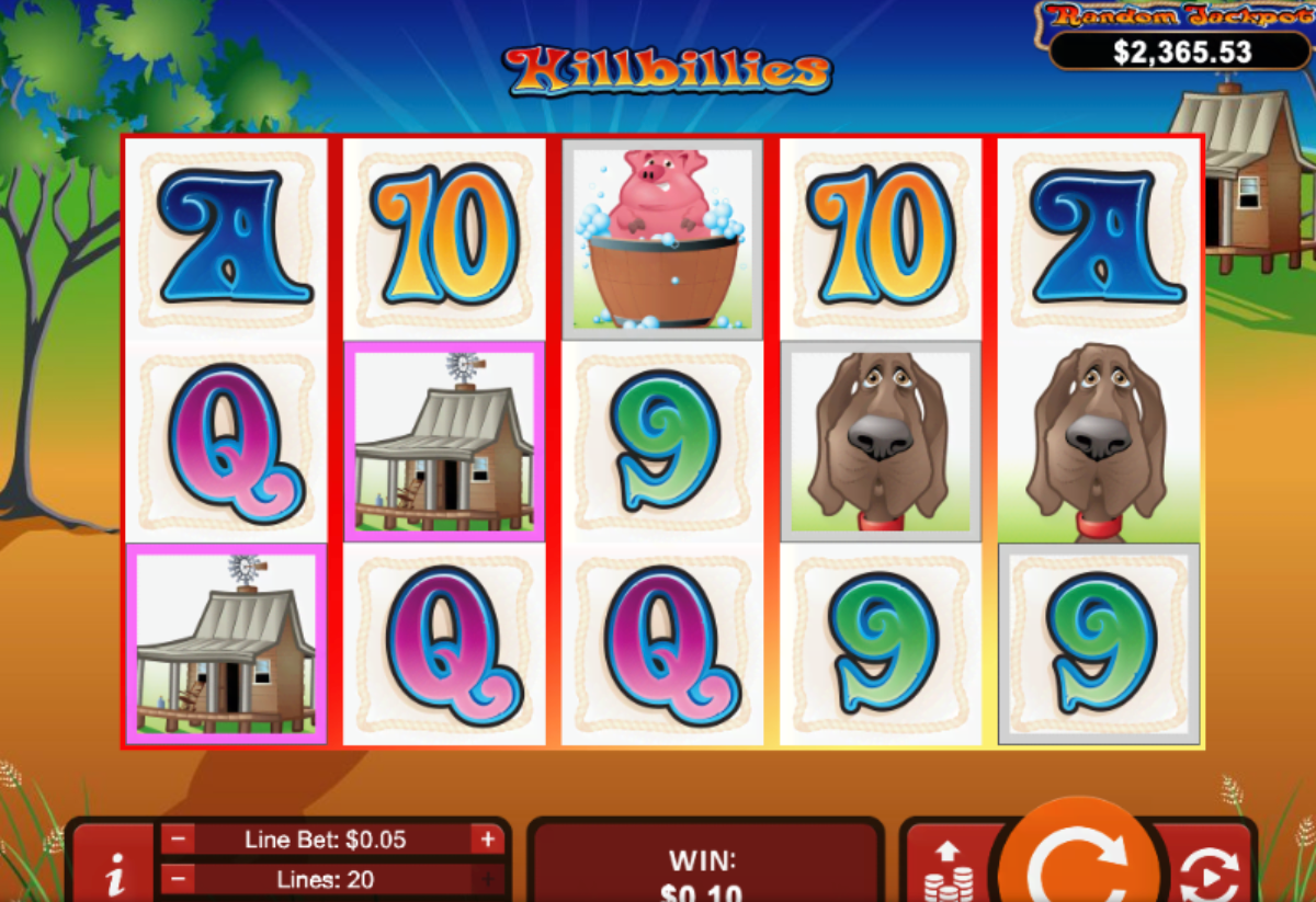 The progressive jackpot triggers at random. When you spin the reels playing Hillbillies, you will see some Appalachian-themed symbols as well as poker playing card icons like the King, Queen, Jack, Ten, Nine and the Ace. The other you will see on the pay lines are the Hound Dog, the Pig, the Hillbilly, the House, the Old Man the, Moonshine and the Blonde Girl.