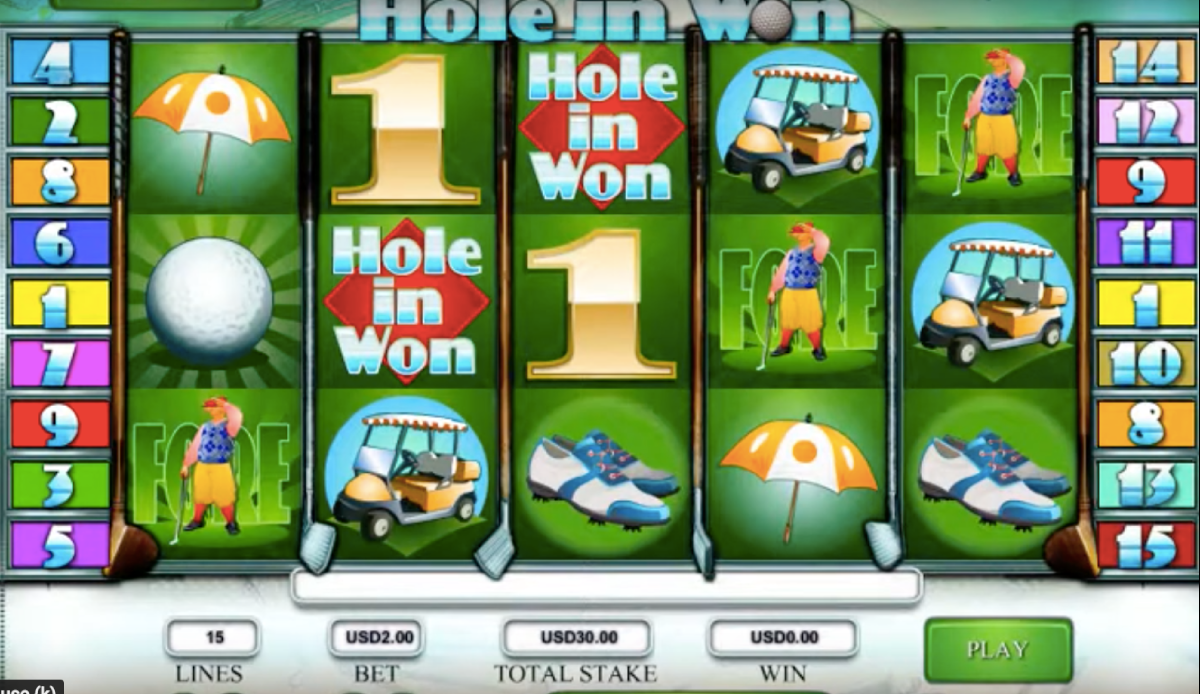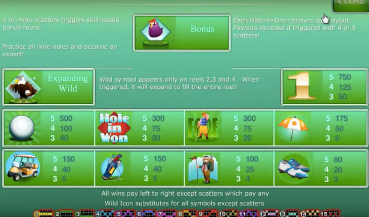 Hole In Won features five reels with fifteen pay lines and a 750X multiplier This game does not have a progressive jackpot, but it does have good size multipliers and many other ways to win like the bonus games and the Expanding Wild Eagles.