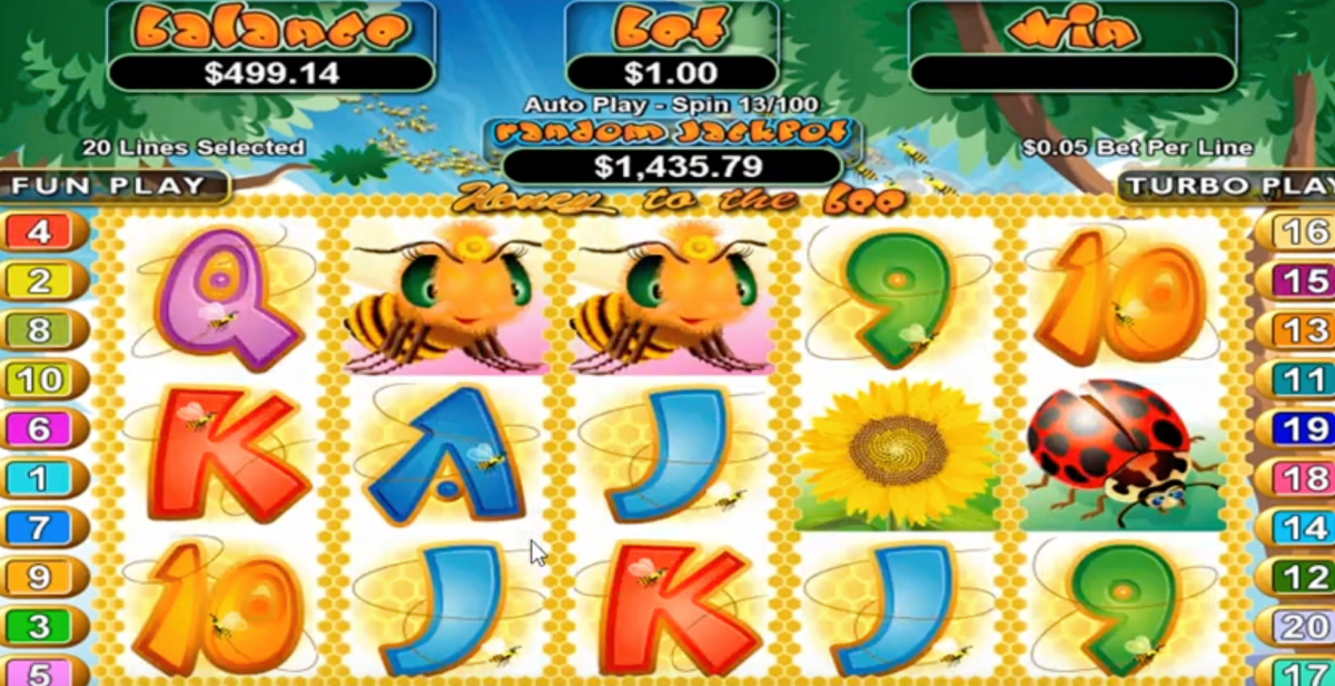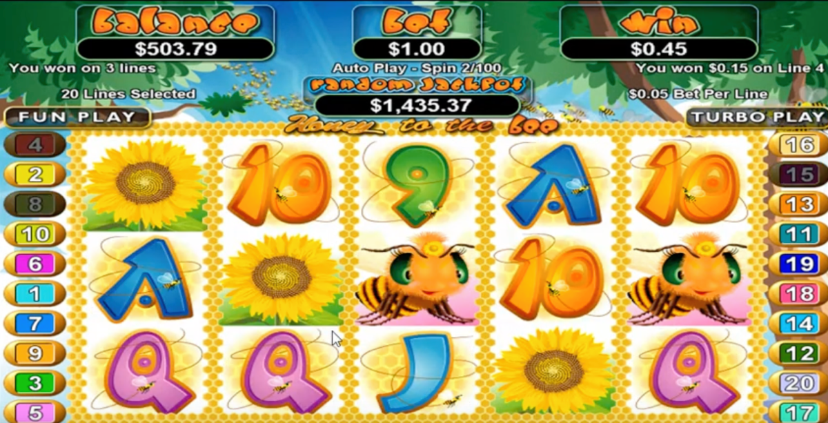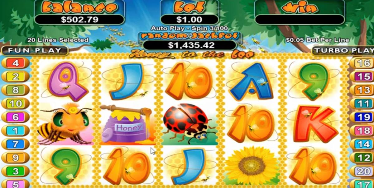 Honey To The Bee features five reels with twenty pay lines and powers Real Time Gaming (RTG) software. The game features scatter wins; a free spins feature, multipliers and a wild substitute symbol with a progressive jackpot.Overall Honey To The Bee is a typical Real Time Gaming (RTG) video slot that was released before they started making their games in 3D.