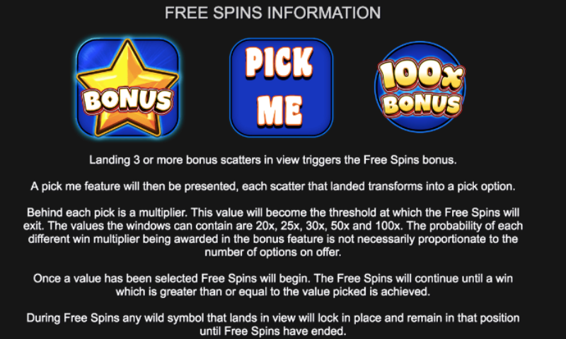 When 3 or more scatter symbols are on the display, it triggers a Pick Me bonus that multiplies the triggering scatters.