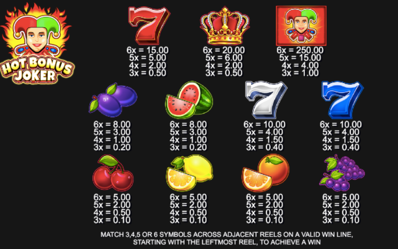 This is a slot machine with a lot of symbols. One of the most important symbols is the crown. It can be worth $100,000. There are other good symbols too, like grapes and oranges. The best part is that you don’t have to bet much to win a big prize!Winning a Hot Bonus Joker game requires at least three symbols in a row starting on the leftmost reel, and scoring 6-of-a-kinds pays up to 250x.