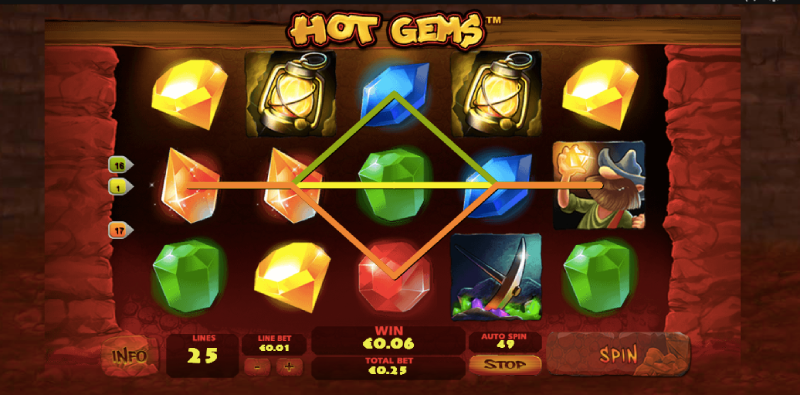 To win at Hot Gems slot, you must get three identical symbols on any of the 25 active paylines. It doesn’t matter which reel the matching symbols appear on.The excitement of playing slots heightens when the game’s special features are activated. The wild rock symbol serves as the game’s wild and can be triggered when it appears on reels 2, 3 or 4. This symbol can replace all other symbols except for the scatter and bonus symbols.
