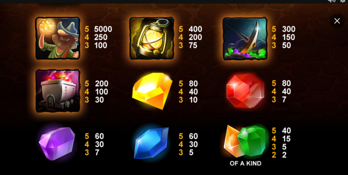 There are 8 jewel symbols on the reels with lower value and also a lamp, pickaxe, and cart full of stones. The symbol of the miner with a grizzly appearance has the highest value. If you land 6 of them in combination, you can get an award of 3.75 times your total stake. He looks like he just came from the Battle of Blair Mountain.