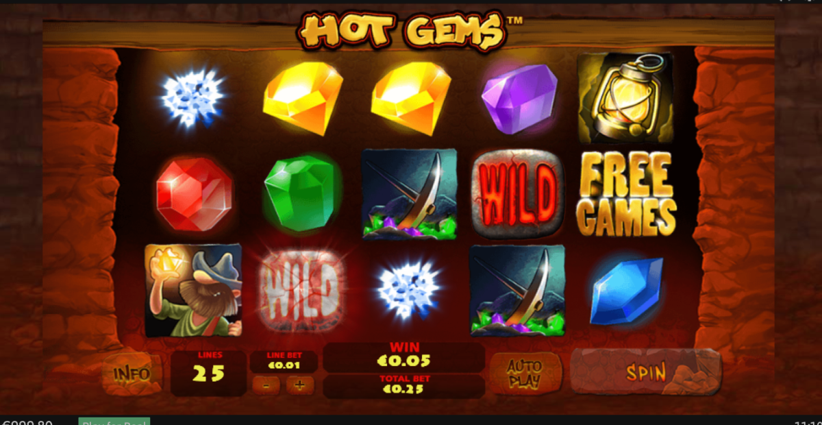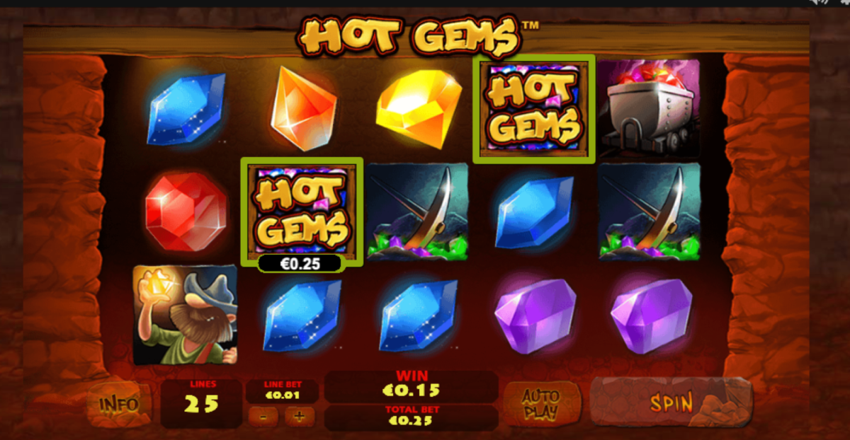 The Hot Gems Xtreme slot has a well-executed cartoon-style design that features a mining theme. The setting is a mine filled with wooden ladders, miniature railroads, and gemstones.