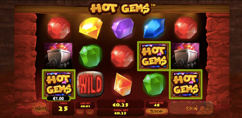 To win at Hot Gems slot, you must get three identical symbols on any of the 25 active paylines. It doesn’t matter which reel the matching symbols appear on.The excitement of playing slots heightens when the game’s special features are activated. The wild rock symbol serves as the game’s wild and can be triggered when it appears on reels 2, 3 or 4. This symbol can replace all other symbols except for the scatter and bonus symbols.
