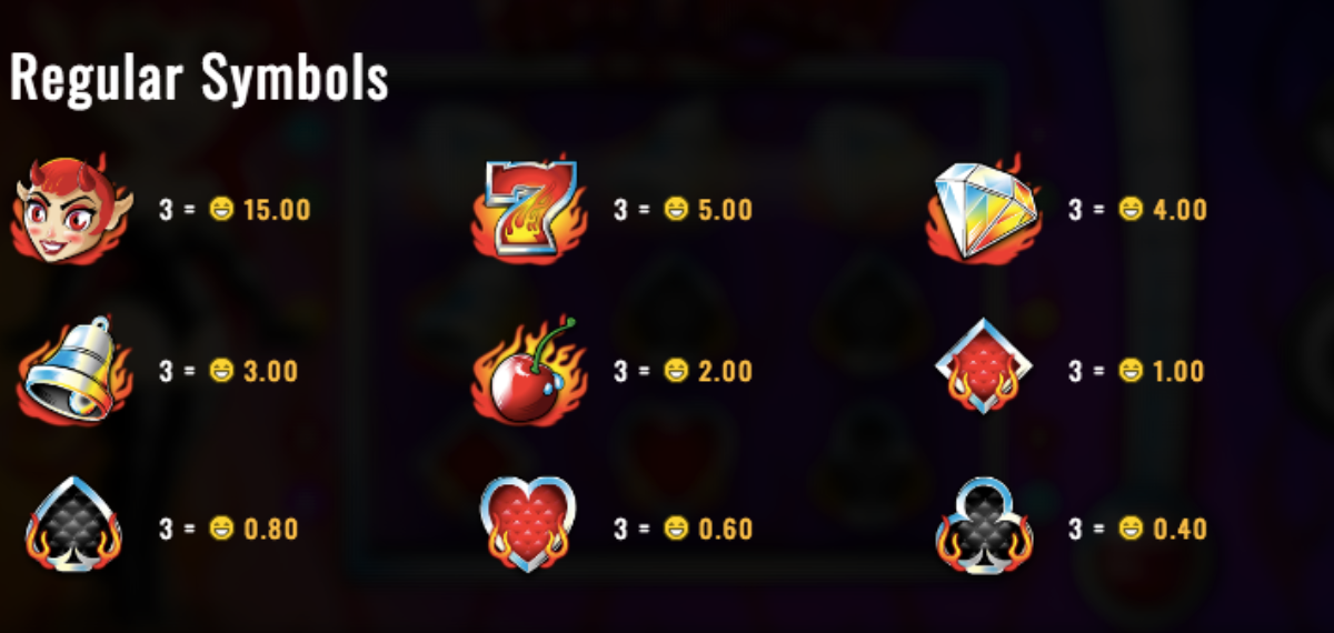 Now that you start to spin the reels, you will meet the she-devil Burnadette. As you spin the wheels, you will see symbols like see Burnadette herself, sizzling sevens, glowing gems, combustible cherries, and blazing bells! Ultimately, this is not your typical classic slot machine game. It features some amazing graphics and a cool storyline.