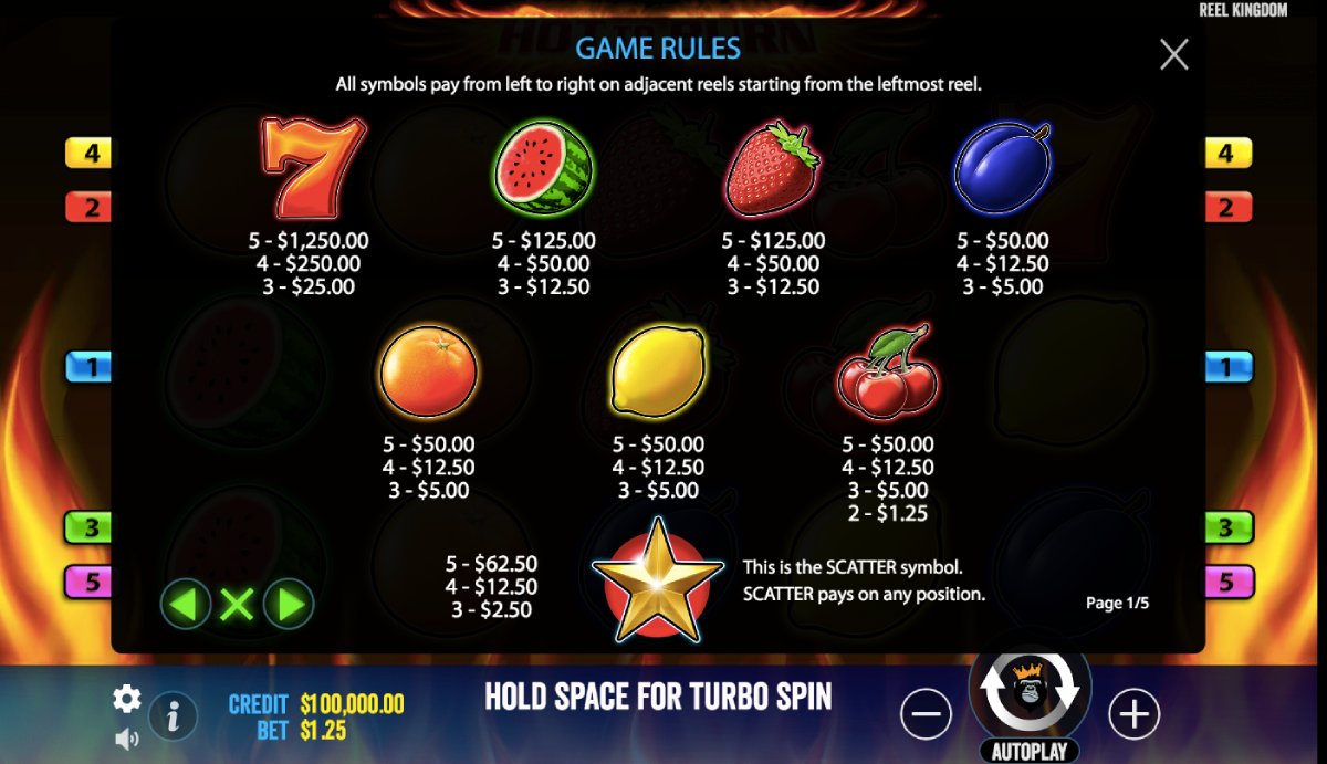 When it comes to the symbols you will find on the reels of Hot to Burn, the game stays true to its classic root. You will find cherries, lemons, oranges, plums, strawberries, watermelons, and 7s. Except for the cherry symbols that can award payout for two on a payline, you will have to match three or more of the symbols on a payline to get a win. The 7 icon is the top-paying symbol, offering as much as 2000x for a five-of-a-kind combination. There is a scatter symbol too, which is represented by a star icon.