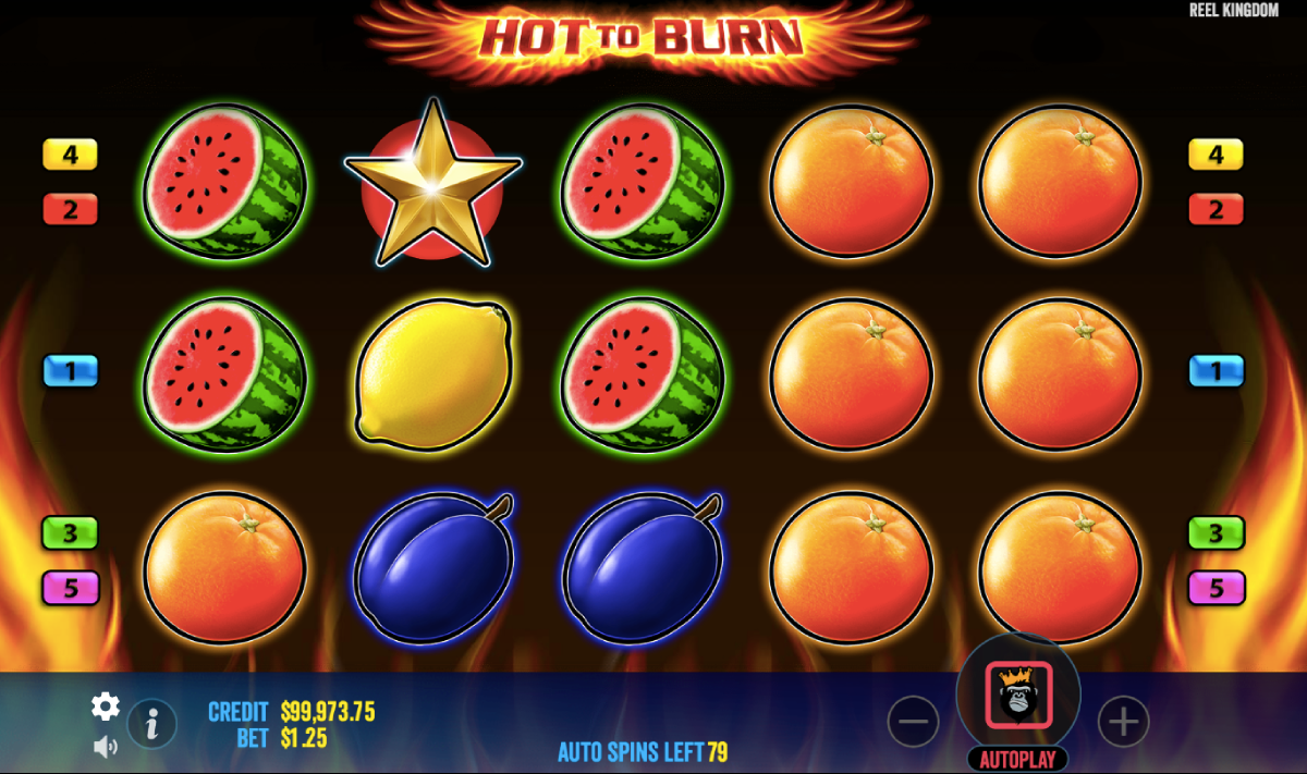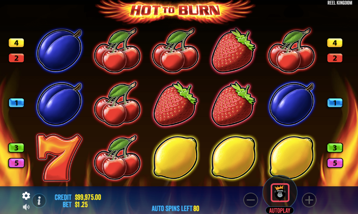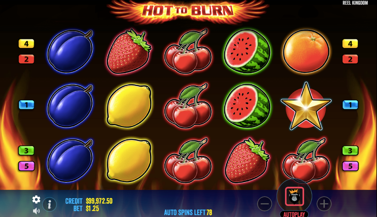 Hot to Burn features a standard 5×3 grid structure, which is not the norm for classic slots . This setup is mostly used for modern games, but remember that Pragmatic Play doesn’t always play by the rule. The developer reduced the number of paylines here to five, however. In spite of the limited number of paylines, this game is open for all kinds of punters from low-limit bettors to high rollers. The available coin values range from 0.01 to 5.00. You can also stake between 1 and 10 coins on each payline. Overall, the betting range is 0.05 to 250.00 credits per spin.