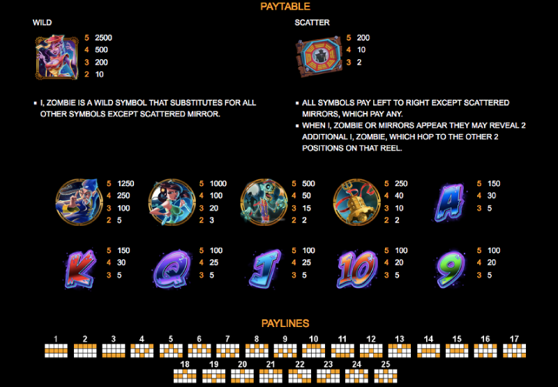 I, Zombie Slot is a slot game from RTG that has 5 reels, 25 fixed pay lines. The ‘Dreadful’ narrative line is combined with the more popular Asian setting in this review.With the high-ranking sign illustrated as a zombie girl and stakes ranging from 0.25 to 125 coins, this terrorizing experience encompasses demonic warfare occultists and beasts’ hunters in China’s big city. The wild, high-rank symbol is labeled as Zombie Girl, with bets limited to 0.25 to 125 coins.