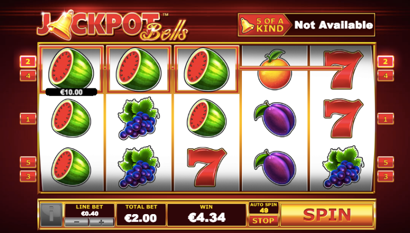 You can adjust your bet on each payline from 0.40 to 5 credits by using the Line Bet menu when playing Jackpot Bells video slot.At the start of each round, your chosen value will be multiplied by 5 and subtracted from your balance. You can view the total bet by checking the Total Bet tab.