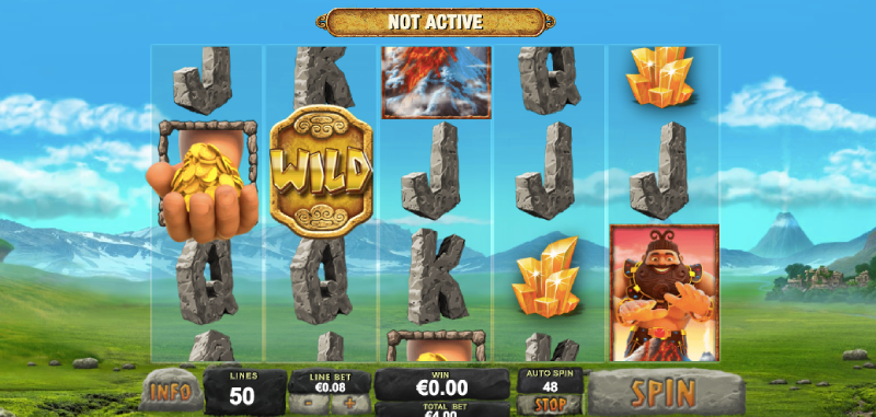 Jackpot Giant has multiple ways to win, although there’s only one bonus feature. The Giant Bonus feature comes into play on the simultaneous landing of bonus symbols on reels one and five. Players will be taken to a different screen displaying six active volcanoes. Three volcanoes are selected in sequence, and a cash prize is given when the Giant tosses a coin into each one of them.