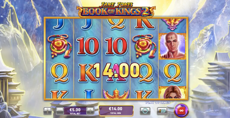 Book of Kings 2 features a snowy mountain landscape in Tibet. The reels showcase snow-covered temples and include Jane Jones and a monk as symbols. Jane Jones is the most valuable symbol in the game and the monk aids her on her quest.You will find talismans and jewelry along with Jane, the monk, and the standard playing card symbols that are all important to Jane’s journey.