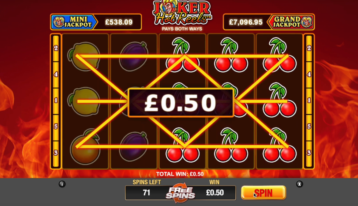 Joker Hot Reels has 5 reels, 3 rows, and 5 fixed paylines. It’s worth noting that winning combinations pay both ways in this slot – from left to right and from right to left. To win, you’ll need matching symbols in a row starting from either reel 1 on the left or reel 5 on the right.