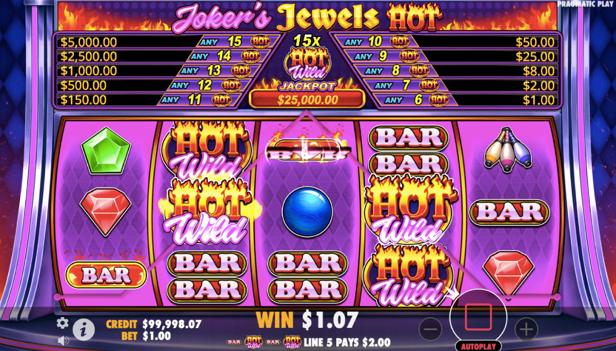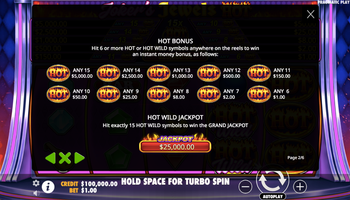 There are some benefits to playing Jokers Jewels. For instance, score the right combination and trigger the 1000X multiplier! We will tell you how to win one thousand times your bet and other ways to win. However, we want to cover a few more things first. The betting range is vast to the point where you can wager one penny per spin. After that, increase your bets up to one hundred twenty-five dollars per spin!