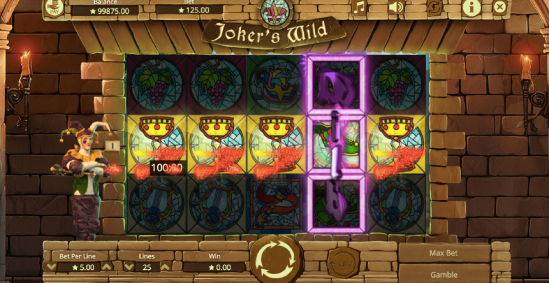 The game Joker’s Wild has a well-designed interface that incorporates the central theme seamlessly. The reel is placed within a structure resembling the walls of a fortified medieval castle. Every detail has been carefully considered.On the left-hand side of the screen, players will see the Joker in traditional clothing. He will be waiting to welcome both the King and the player, but he will not appear on the reels. Instead, he will simply watch and offer a calming presence.