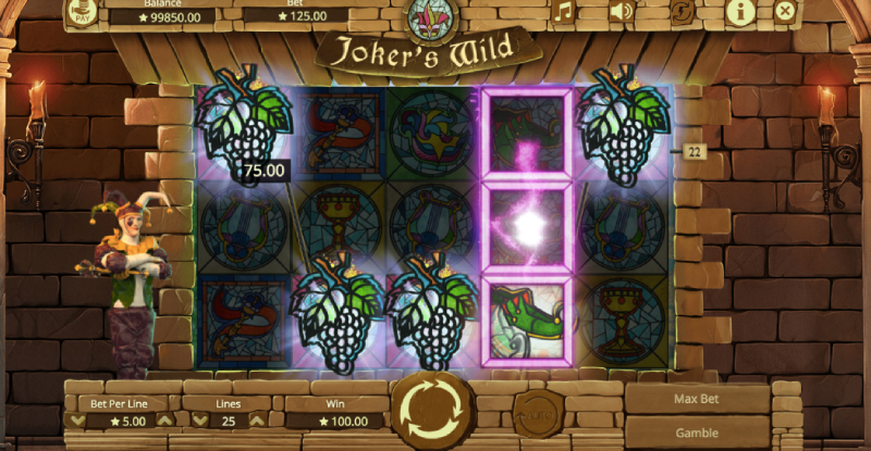 The game is designed with all the important elements seamlessly blended together, creating a smooth experience. The buttons to adjust bet per line and number of lines for the next spin are located on the stone floor below the reels and are very responsive.In the game, the symbols are portrayed as stained glass panels on the reels, featuring intricate designs including golden chalices, grapes, jester hats, and boots that match the game’s medieval theme beautifully. Joker’s Wild has a light-hearted and accessible ambiance.
