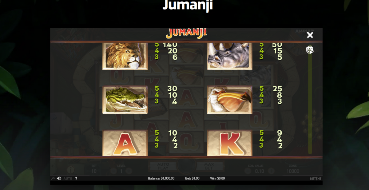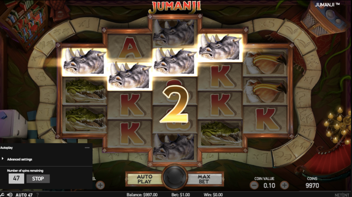 Scatter symbols are effective toward putting you into some extras, so you will want to be on the lookout for the Jumanji Box. When you get three or more on any spin, you get to go right into a mini-version of the Jumanji board game. Then you get to roll the dice up to eight times, depending on how many scatters you got, and move your token about the board, with wins along the way.